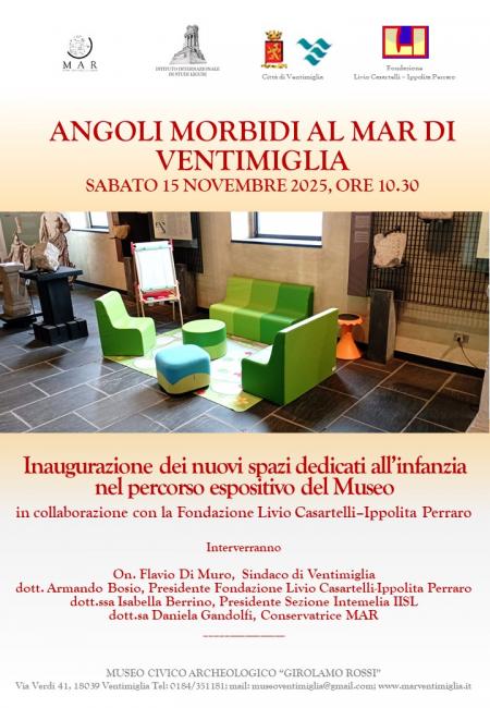 Sabato 15 novembre alle ore 10.30, alla presenza del Sindaco della Città di Ventimiglia On. Flavio Di Muro, del Presidente della Fondazione “Livio Casartelli-Ippolita Perraro” dott. Armando Bosio, della Presidente della Sezione Intemelia dell'IISL dott.ssa Isabella Berrino e della Coservatrice del MAR dott.ssa Daniela Gandolfi, verranno presentati al pubblico gli “Angoli morbidi” realizzati all'interno del percorso espositivo del Museo, grazie al contributo economico della Fondazione “Livio Casartelli-Ippolita Perrraro”. Formati da tre postazioni destinate ai visitatori più piccoli, i bimbi della prima infanzia e della scuola primaria, sono composte da divanetti, sgabelli, tavolini, piccole librerie, tappeti antitrauma, realizzati in materiali colorati e accattivanti e costituiranno delle oasi dedicate alla prima infanzia che potrà trovare nel Museo occasione di gioco e apprendimento, in dialogo con i reperti esposti (ceramiche, lapidi, statue, vetri, etc.), testimonianza degli antichi abitanti della città di Albintimilium. Un ulteriore traguardo per il Museo Rossi da sempre particolarmente attento alla formazione delle giovani generazioni e alle attività ludico-didattiche.